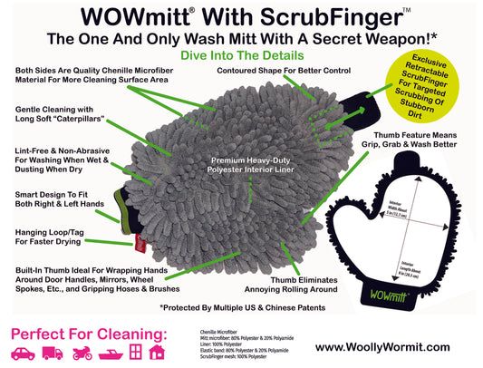 The multi-patented WOWmitt is the only wash mitt in the world with the “secret weapon” – the Scrubfinger. This innovative wash mitt is designed to both gently clean and gently scrub targeted areas. Perfect for cleaning cars, boats and household items!
