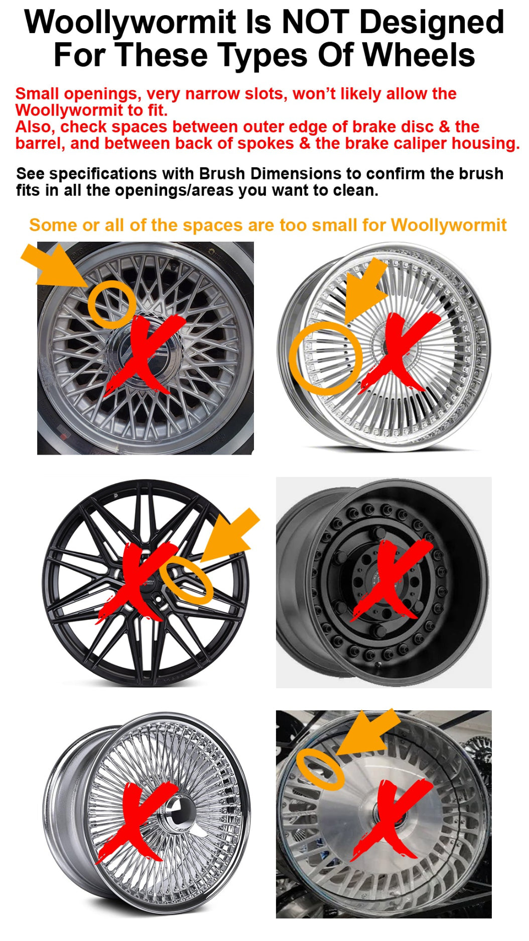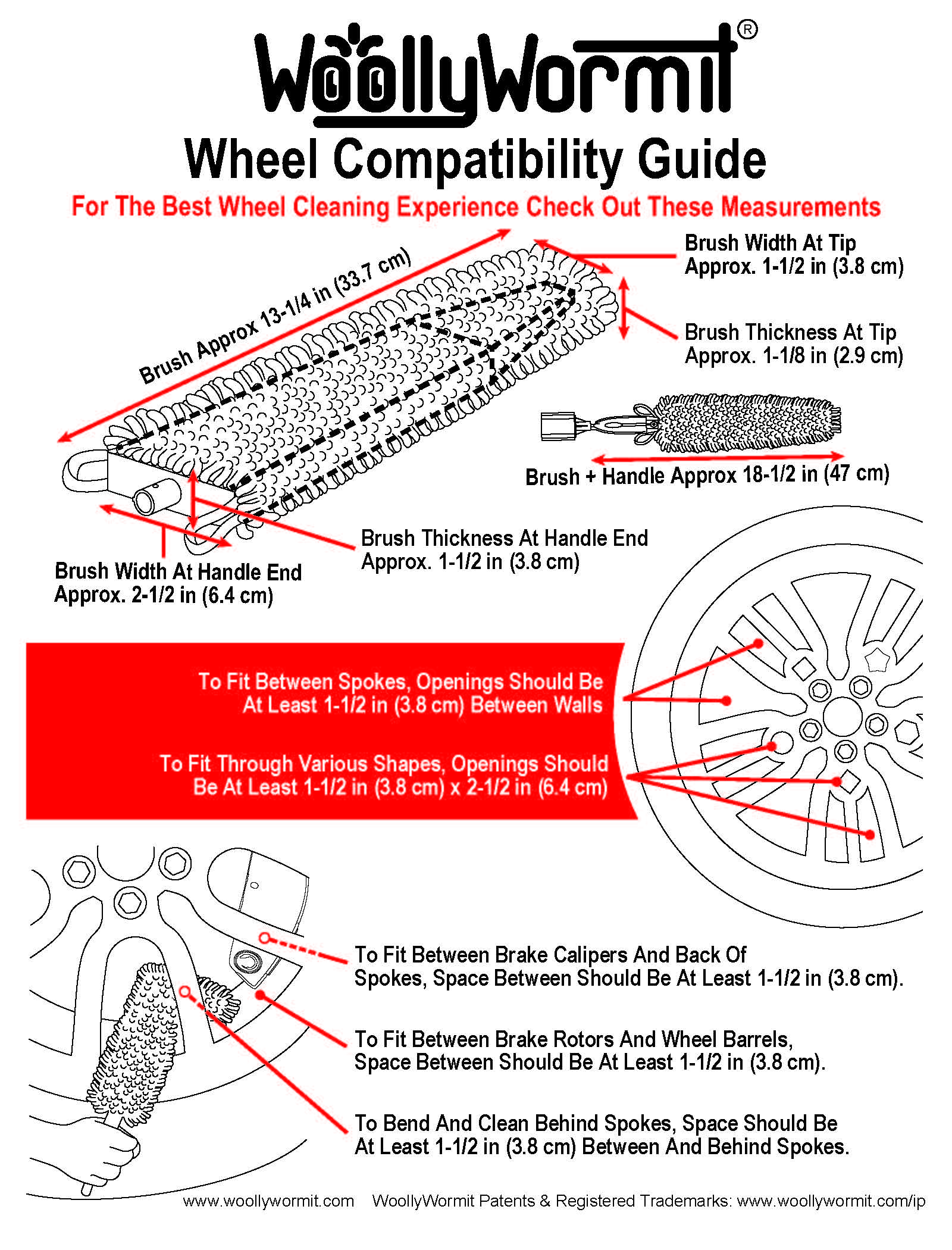 The following image provides some dimensions for your reference. Please check the measurements of all the areas and openings of your wheels (between the spokes, behind the spokes, between the outer edge of brake disc and adjacent wheel barrel area, any openings, etc.). The goal is to give the brush enough room to move in and out, and back and forth, and to get behind the spokes. If the openings are close to the dimensions of the brush, then in and out motions are about what you’ll be able to do. To get an idea of the types of wheels that work best with the Woollywormit, please see the images via the link called Various Types Of Rims LINK