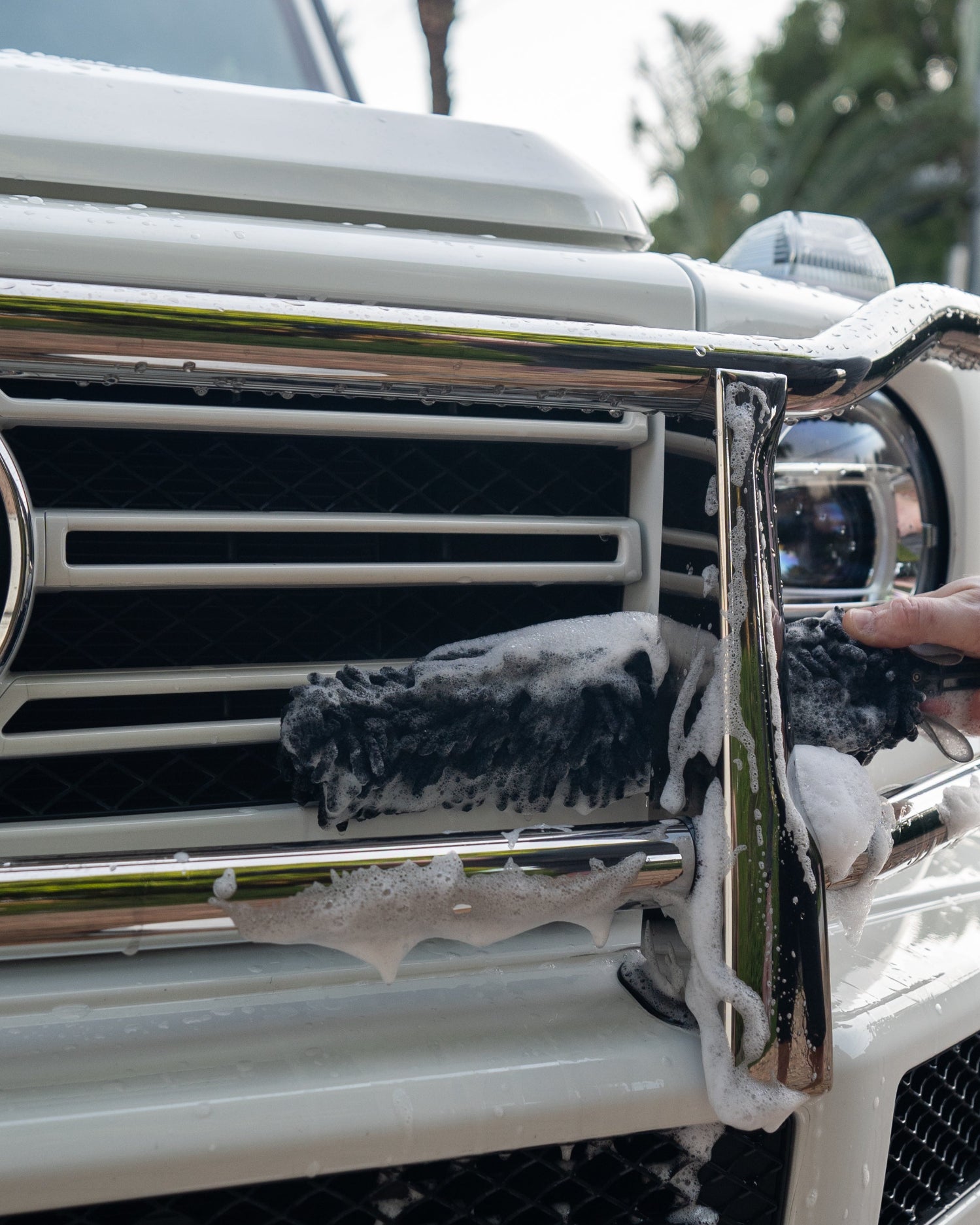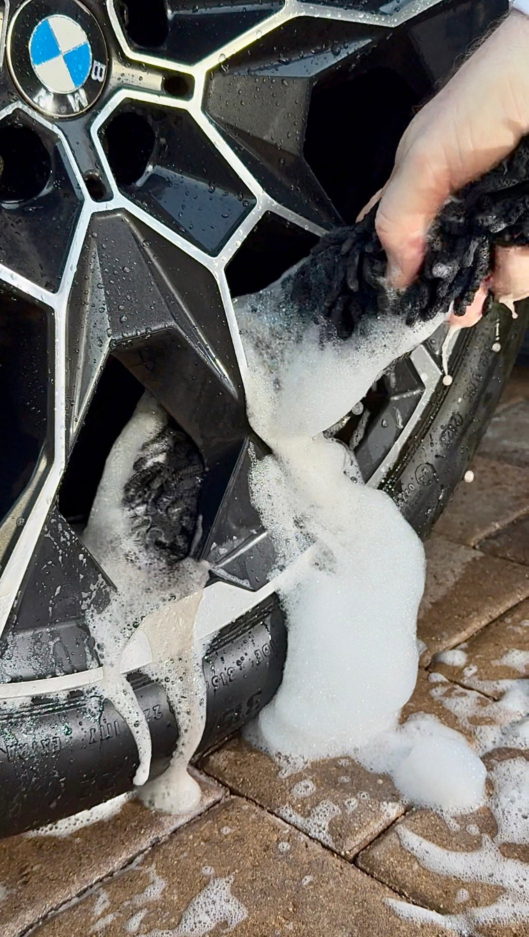 Select the right cleaning tools for efficiency, effectiveness and prevention of damage. For cleaning the wheels, select a brush that reaches most or all areas, and doesn't have exposed metal parts to scratch wheels or have hard bristle brushes. For washing the car body, use a quality microfiber mitt, like the Woollywormit WOWmitt that doesn't hold or attract grit and abrasive dirt which scratches surfaces. The WoollyWormit Wheel Brush and WOWmitt are designed and built specifically for cleaning efficiency, effectiveness, and protection of delicate surfaces. Unlike most regular wheel brushes, users have the opportunity to clean more areas and more hard-to-reach places with the WoollyWormit Wheel Brush - and do so without having a metal/plastic spine or twisted metal spine can make damaging contact with the wheel surfaces. The WOWmitt is a multi-patented wash mitt with the exclusive ScrubFinger and has a built in thumb that makes washing the car body and the mirrors, door handles, grill, etc., easier than ever. Plus, you can hold the hose, pick up the bucket, hold the the wheel brush, all without removing the mitt.