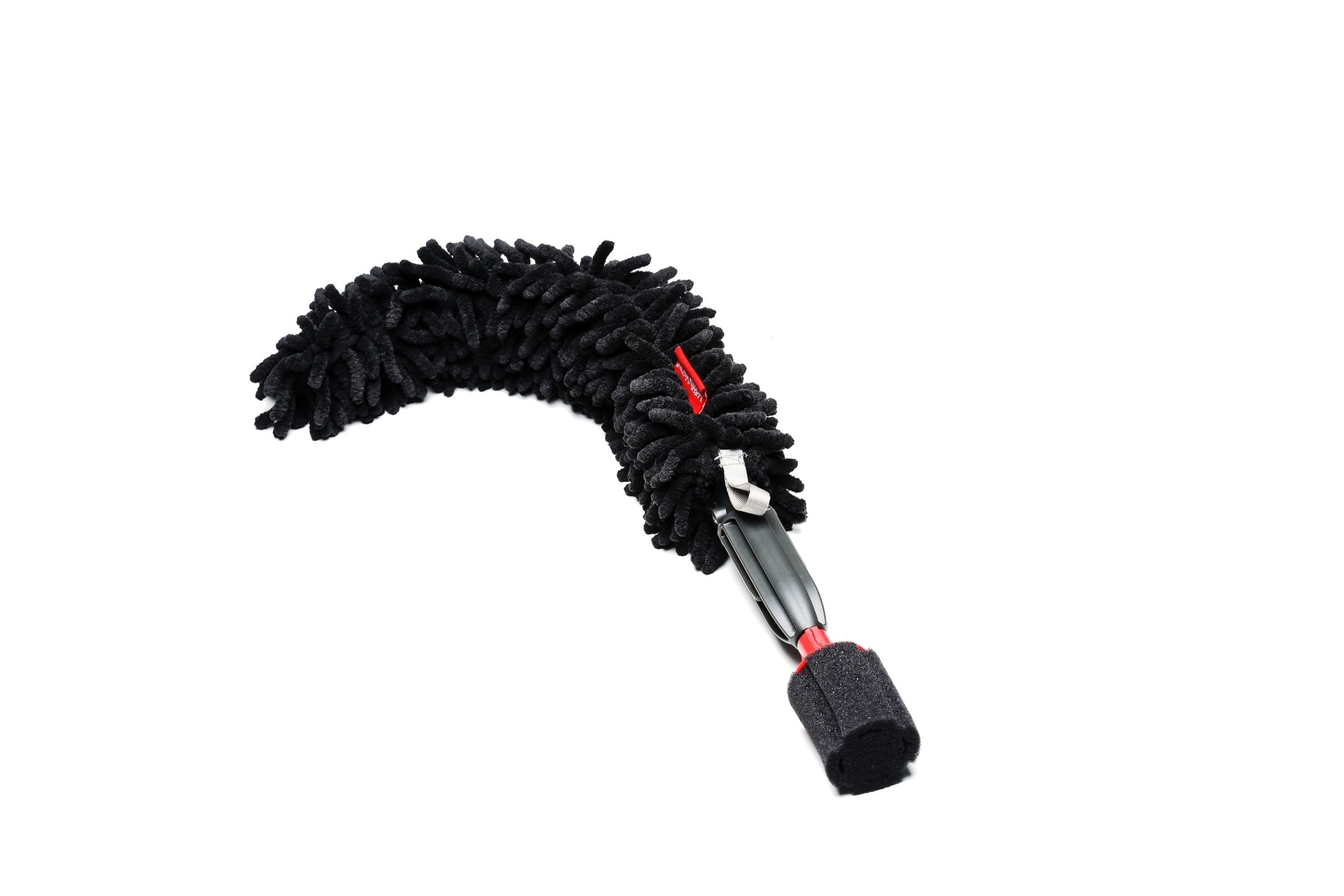 As with all the products Black Tie Brands develops, invents or patents, the goal is to simply find better ways of doing things. The wheel brush is no different. It may sound a little boastful, but our wheel brush may be one of the most engineered wheel brushes in the world. This patented brush was designed specifically to address many or most of the challenges with cleaning wheels: cleaning as many of the hard-to-reach places as efficiently as possible, and to do so without damaging the wheels. This includes cleaning deep inside the wheel barrels, back behind the spokes, and especially in and around the hard-to-reach lug nut areas. Additionally, the brush was designed so that there are no exposed metal parts, especially like those found in the bristle brushes with center twisted wire metal cores. The brush was designed to be flexible, yet rigid, so scrubbing is possible where your hands don't reach. Our brush was built from the ground up, to address a number of issues commonly found with the typical wheel brushes, and to make cleaning better and more efficient. Some of the most obvious differences is that the brush has an integrated lug nut cleaner, it is longer than most, it is wrapped in soft Chenille microfiber. Additionally, the cover can be removed for cleaning or switched out for another cover for other cleaning functions.